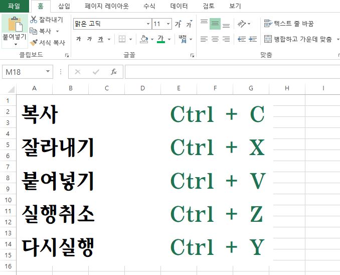 이 단축키는 엑셀 뿐만 아니라 모든 컴퓨터 프로그램에서 사용가능하기에 이 단축키들은 꼭 외워 사용하시기를 추천합니다.