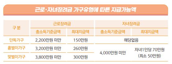 가구원 구성에 따라 연간 부부합산 총소득금액이 기준금액(단독22백만원, 홀벌이32백만원,맞벌이38백만원) 미만이어야 하며, 총급여액 등에 의하여 장려금 산정