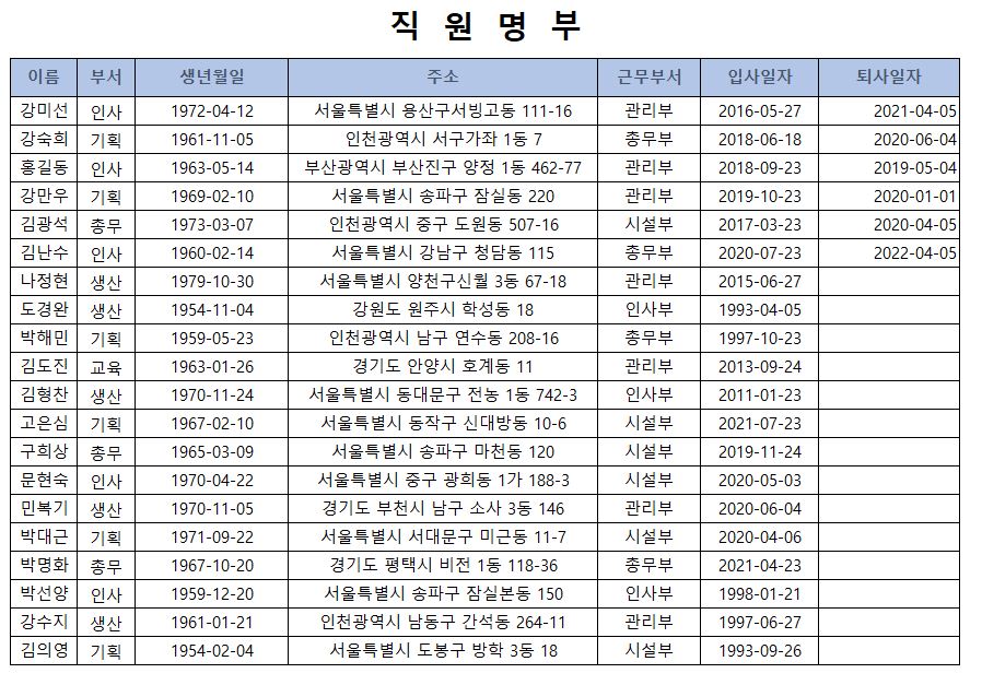 - 제목을 제외한 직원명부 전체 블럭 지정 후, 왼쪽 위 '이름상자'를 클릭 후 '직원명부'라고 입력 후 엔터