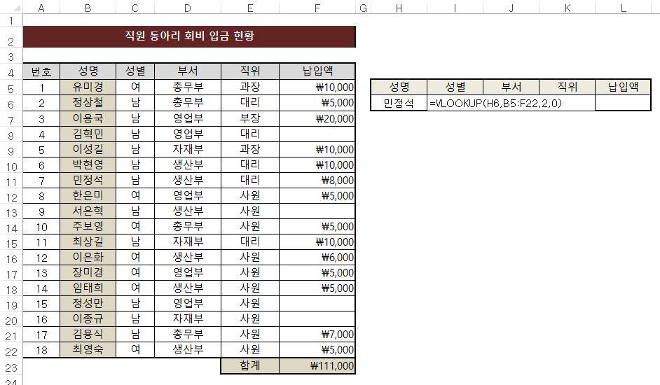 B5:F22 : 민정석 이름에 대한 데이터를 찾기 위해 회비입금현황표를 범위지정한다. 표는 A열부터 시작하지만, 내가 찾고자하는것이 성명이므로, 번호를 제외하고 성명부터 범위를 잡아줘야한다.