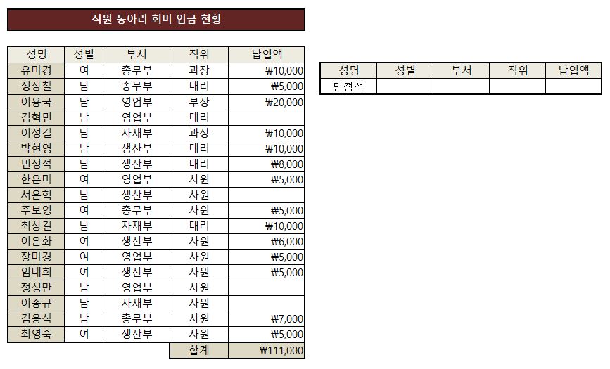 직원 동아리 회비 입금 현황표가 있다. 전체 표 중에서 개인별 자료를 추출하고 싶다면, 성명을 찾은뒤, 성별, 부서, 직위, 납입액을 확인하게 된다.