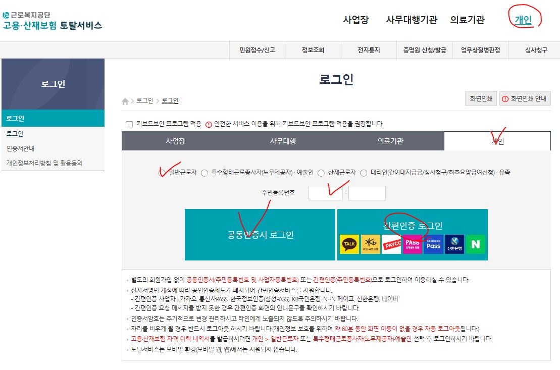 고용산재보험 토탈서비스에 접속을 한후 개인으로 로그인을 합니다. 공동인증서로 로그인하거나, 간편인증로그인을 이용하여 본인 인증후 로그인을 합니다.