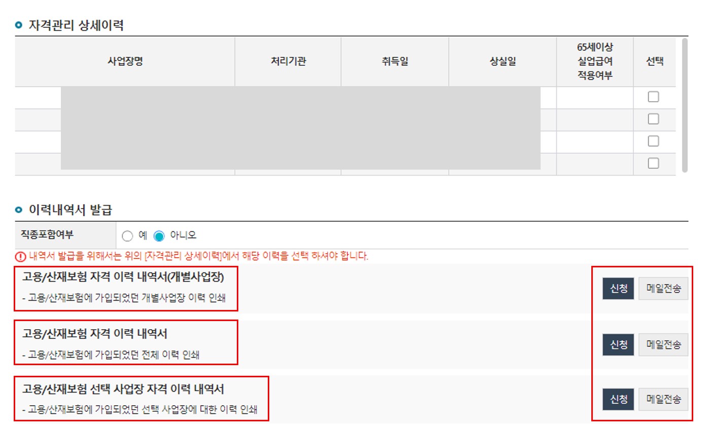 자격관리 상세이력에서 출력하고자 하는 사업장명을 체크 후, 아래 직종포함여부 선택, 아래 발급조건을 확인후 필요한부분에 대해 신청을 하면 됩니다. 인쇄하거나, 메일전송을 받을수 있구요.