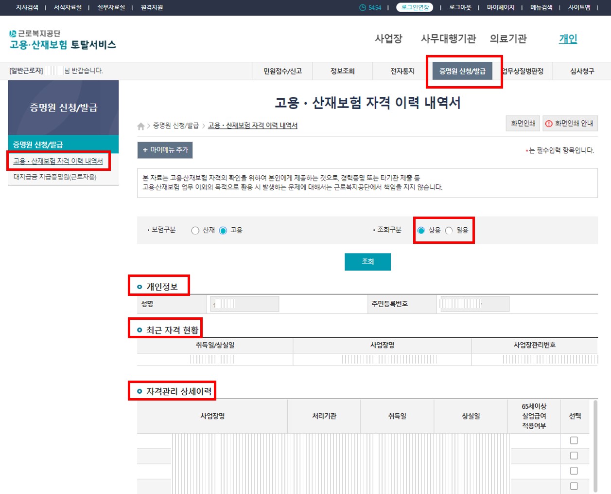 보험구분 산재,고용 / 상용,일용 선택을 조건에 맞게 선택후 조회를 누르면 아래 개인정보, 최근자격현황, 자격관리상세이력이 나옵니다.