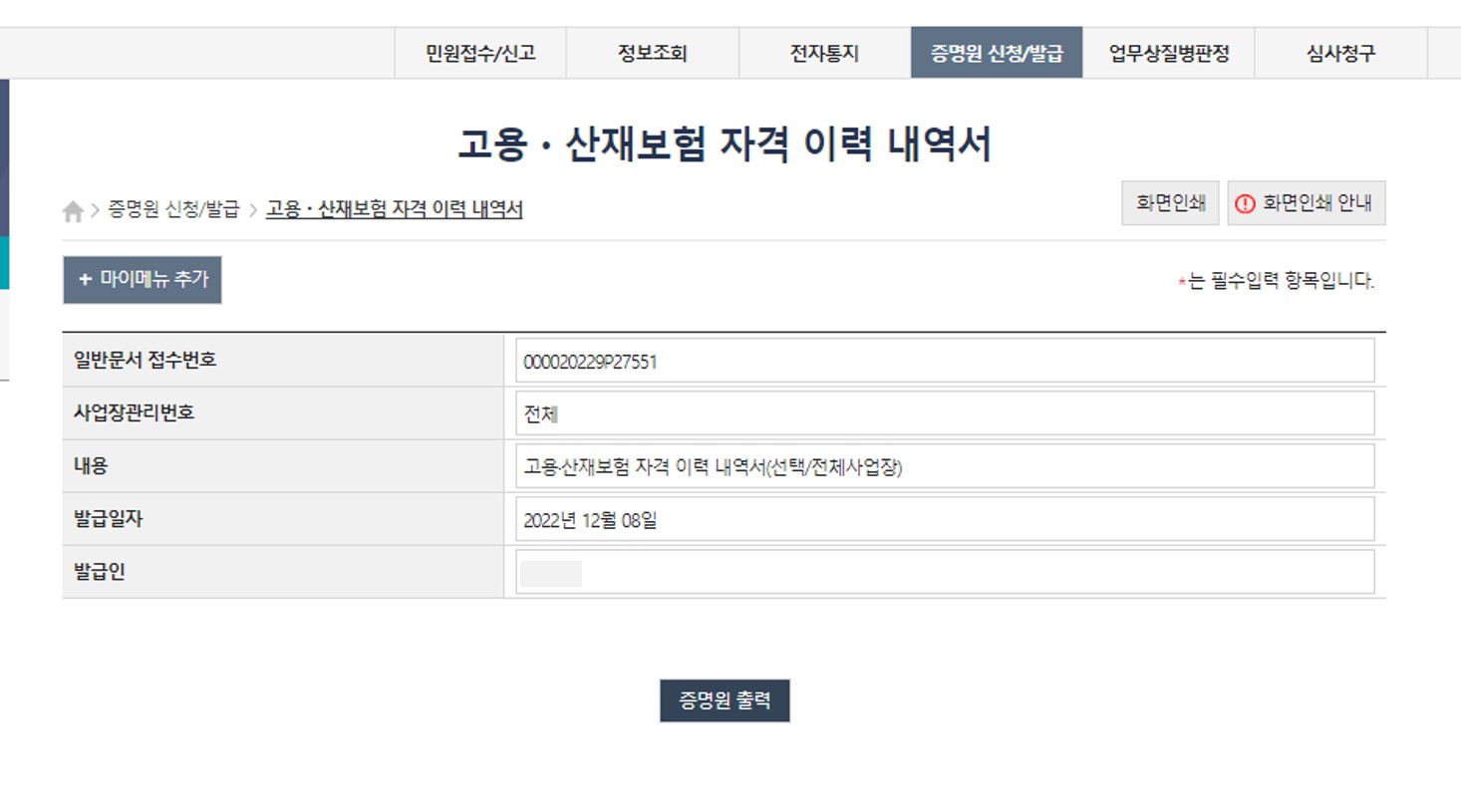 증명원신청/발급-고용산재보험 자격 이력내역서 클릭
