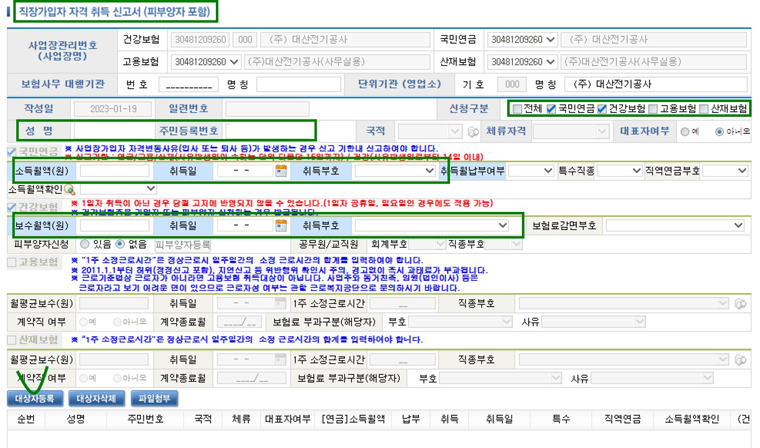 자격취득신고서 화면이 열리면 성명, 주민등록번호를 입력하고, 오른쪽에 국민연금/건강보험 원하는 항목을 체크해줍니다.