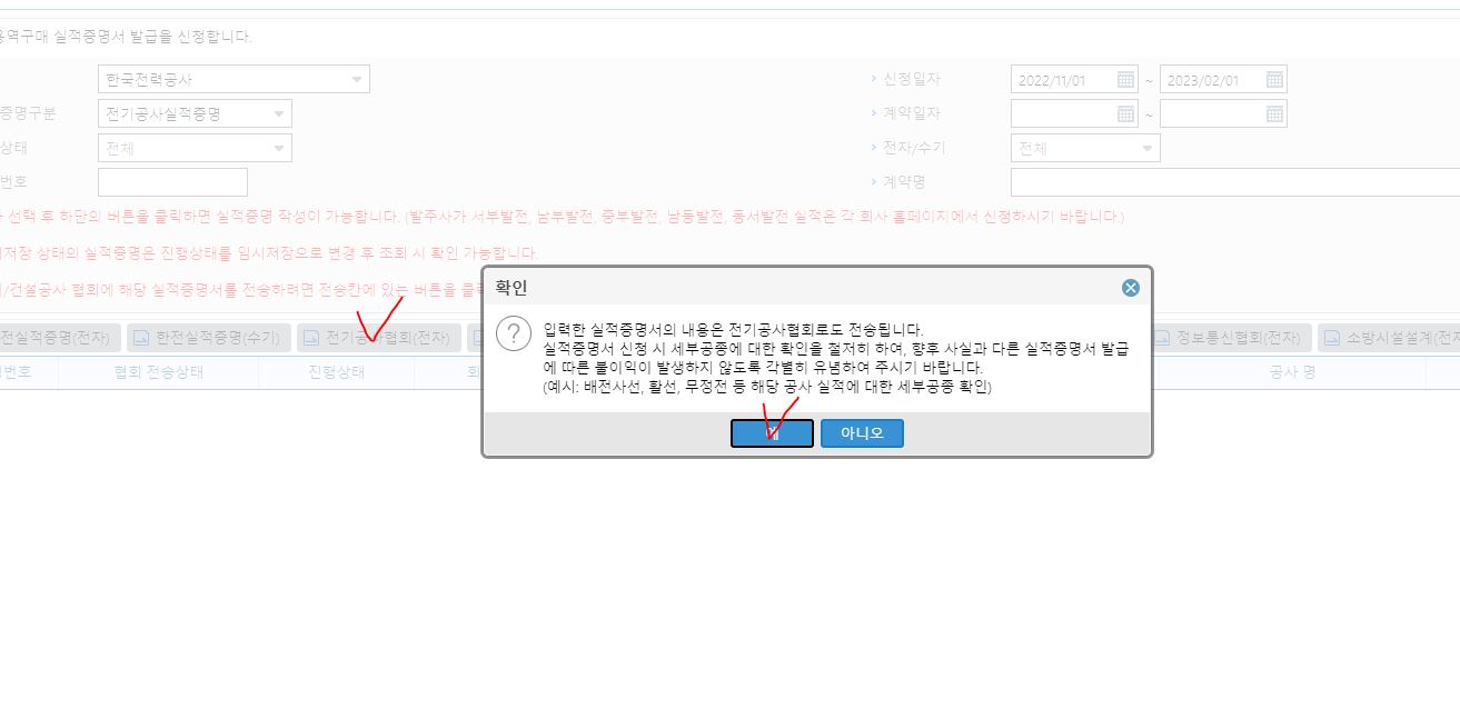 전기공사협회(전자)를 클릭화면 위 화면처럼 나오고, 예 눌러서 진행합니다.