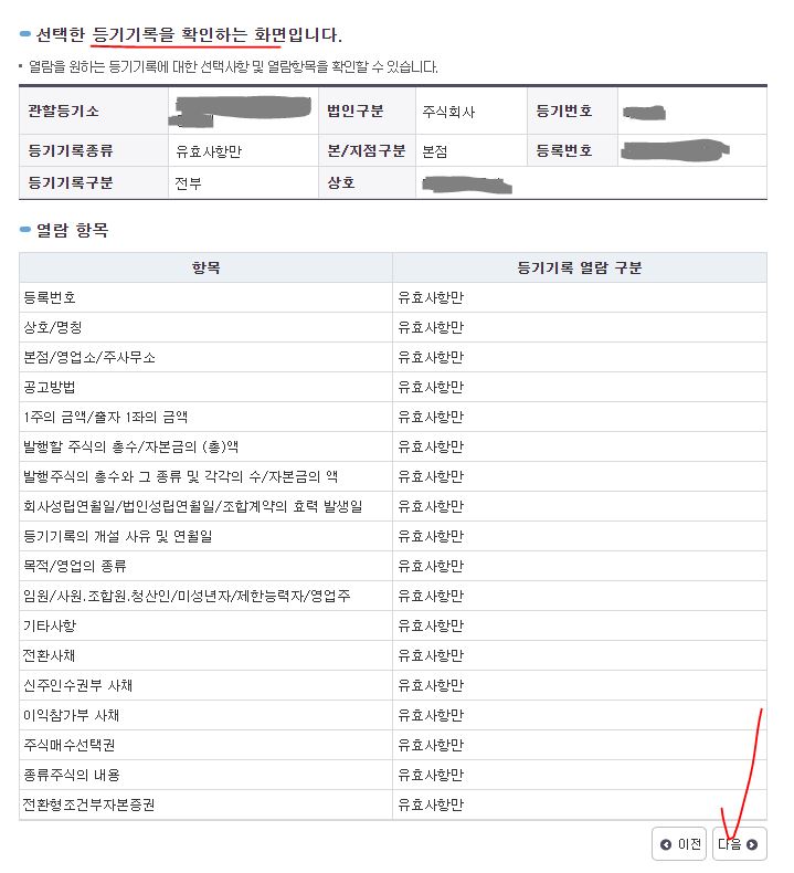 열람할 등기기록 항목을 선택 후 다음 진행을 누릅니다. 기본적으로 선택이 되어있기때문에 특별한것이 없다면 바로 다음 눌러서 진행하면 됩니다.