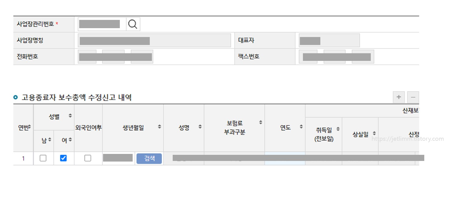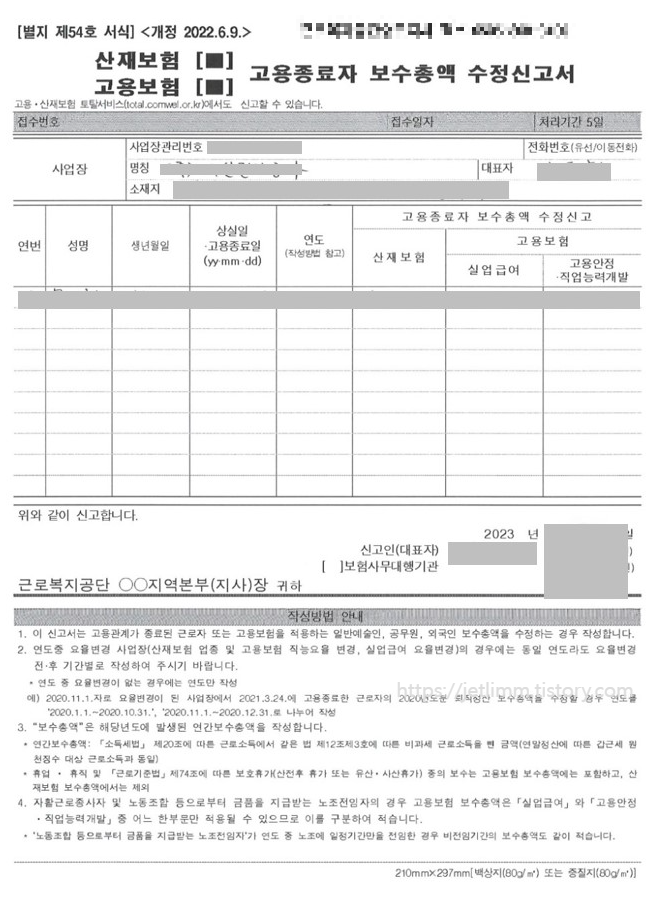 사업장관리번호 / 전화번호 / 명칭 / 대표자 / 소재지 를 모두 기입하고, 하단에 수정하고자 하는 퇴사자 이름과 생년월일 상실일 / 연도 / 고용보험 산재보험의 수정된 보수총액을 기입합니다.