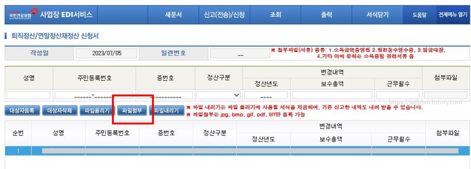 대상자등록을 하면 하단 목록에 수정신고 대상자의 정보가 표시가 되며, '파일첨부'를 눌러 증빙자료를 첨부해줍니다. 증빙자료를 급여대장 또는 이체내역서 등 을 첨부해줍니다.