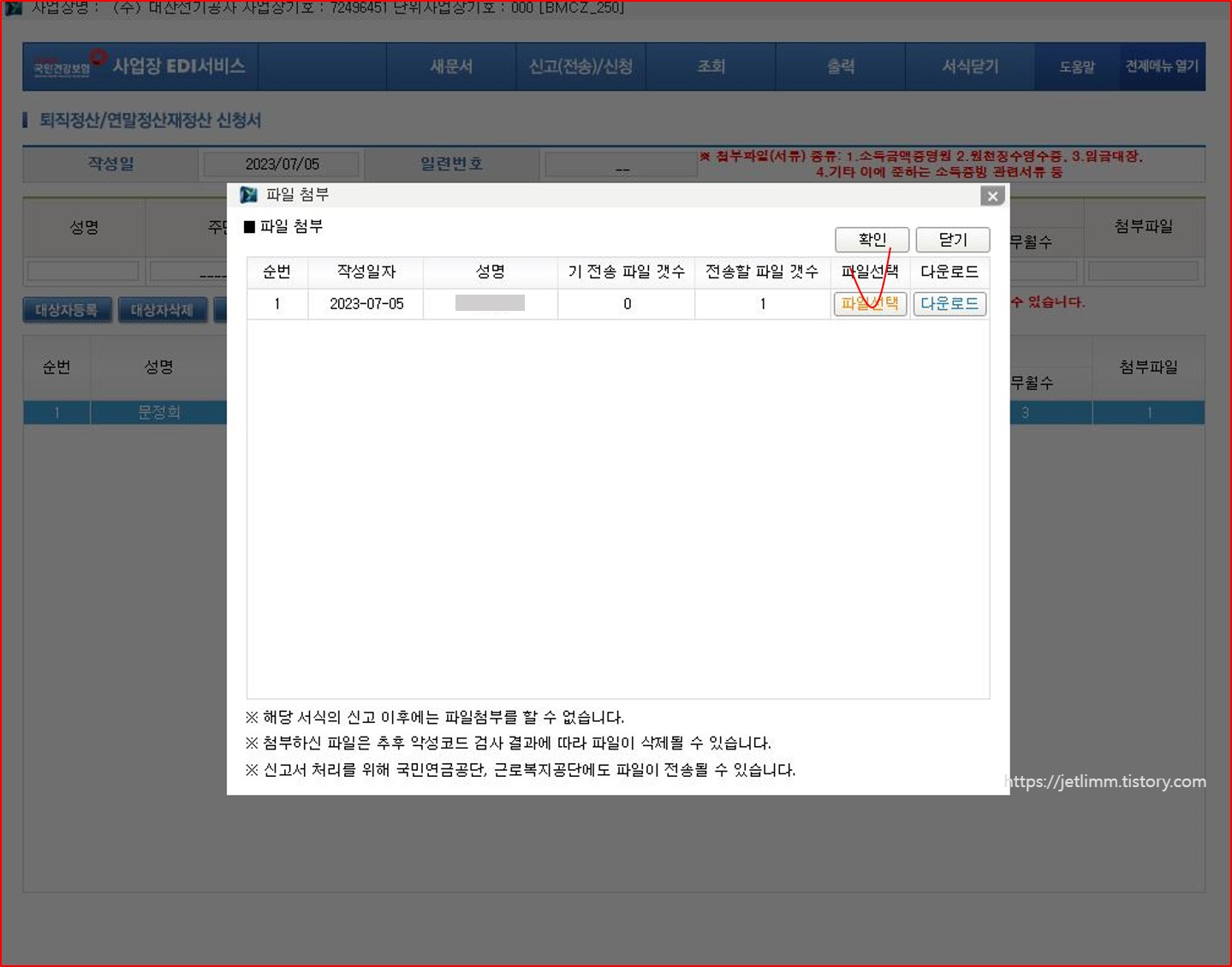 파일첨부 창이 열리면 파일선택을 한 후 증빙자료를 추가해주고 확인을 누른 후 상단에 신고(전송)/신청을 눌러 전송을 해주면 '퇴사자 보수 수정신고'가 완료됩니다.