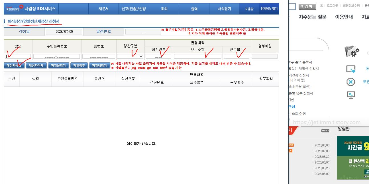 [신고/신청] - [건강보험료] - [퇴직정산/연말정산 재정산 신청서] 를 클릭합니다.