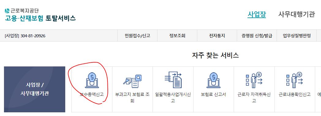 고용.산재보험 토탈서비스로 들어가서 첫 화면에 '보수총액신고'를 클릭합니다.