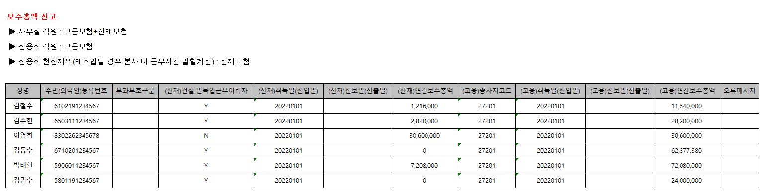 상용직 근로자 자료를 정리한 데이터를 가지고, 보수총액 신고서를 작성합니다.