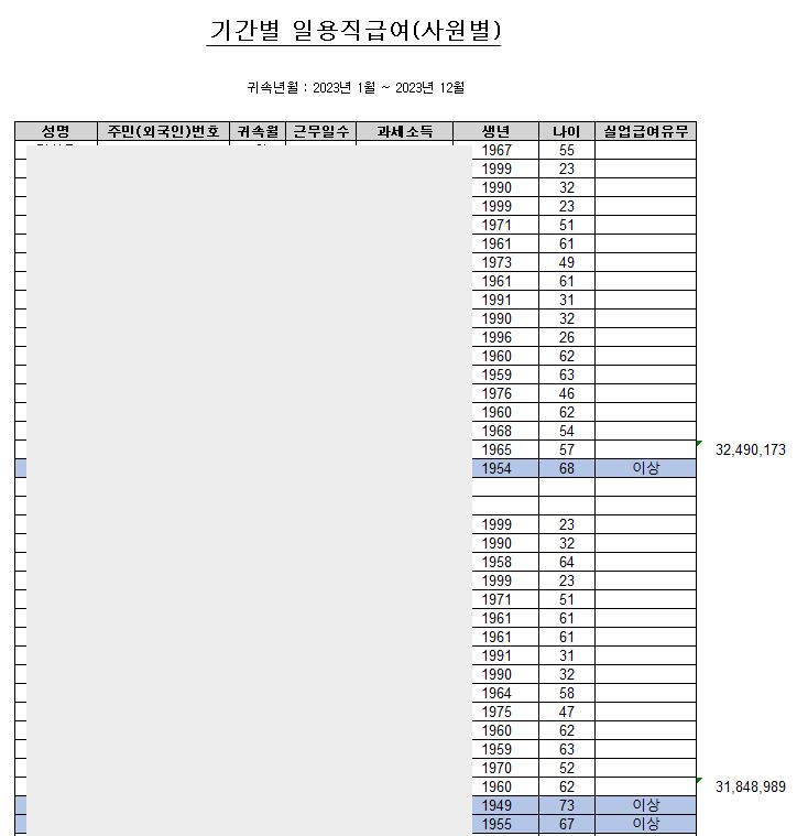 우리가 할 것은 근로자의 월별 급여 취합과, 총합계, 65세 이상과 아닌 것을 구분하여 정리해 두면 됩니다.