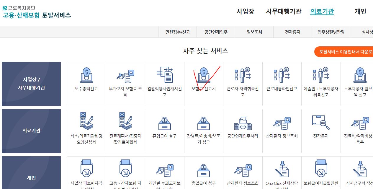 고용산재 토탈서비스에 접속 후 보험료 신고서를 클릭합니다.