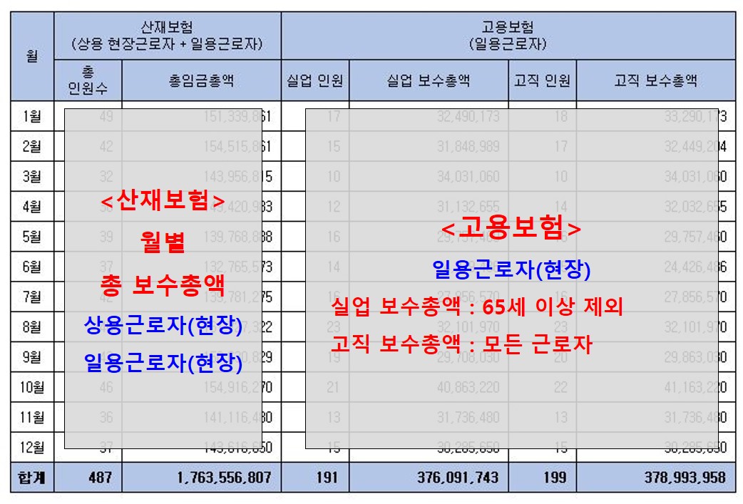 보험료 신고는 일용근로자의 고용보험, 산재보험 신고와, 상용직 현장근무자에 대한 산재보험을 신고하기 때문에 이렇게 자료를 취합해서 월별로 정리를 해둡니다.