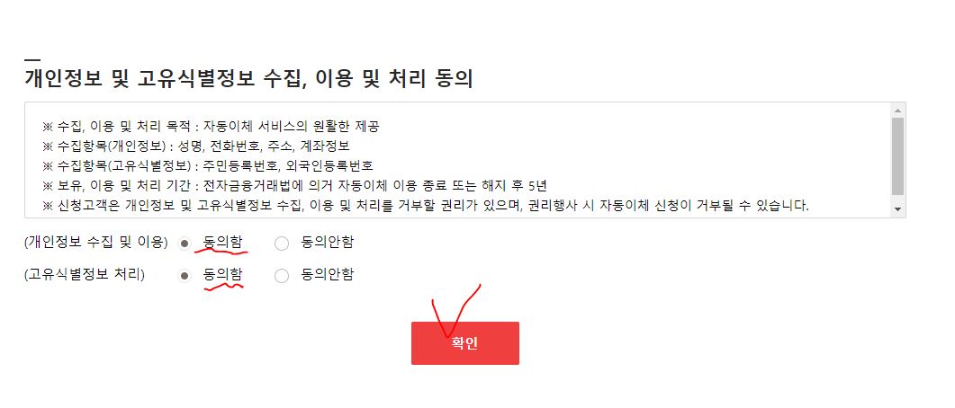 화면을 아래로 내려 개인정보 수집 및 고유식별정보처리 동의함으로 확인 클릭!!!