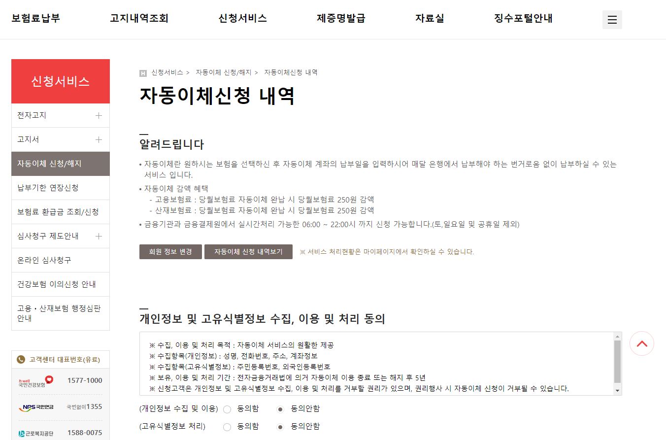 단!!! 건설일용직 사업장에 대해선 자동이체가 불가합니다. 일용직 사업장을 매달 보험료가 변동이 되기때문에, 고지서를 받아도, 일용직 급여 변경 신고후 정산받아서 납부가 되기 때문에 자동이체는 불가네요.