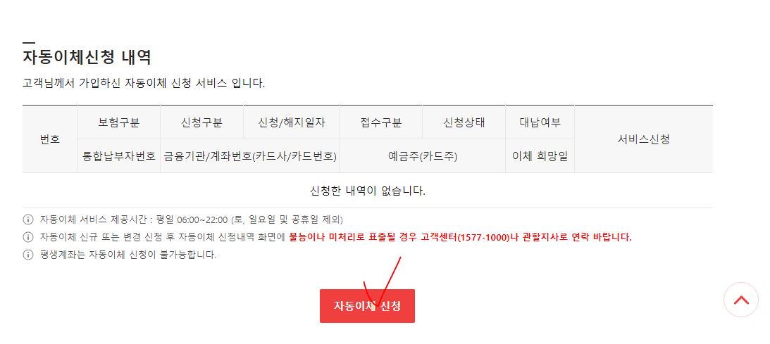 만약 인터넷으로 신청이 불가능하다면, 사회보험통합징수포털 사이트에서, 자동이체 신청서를 다운로드하여, 내용작성 후 건강보험공단 관할지사에 FAX접수도 가능합니다.