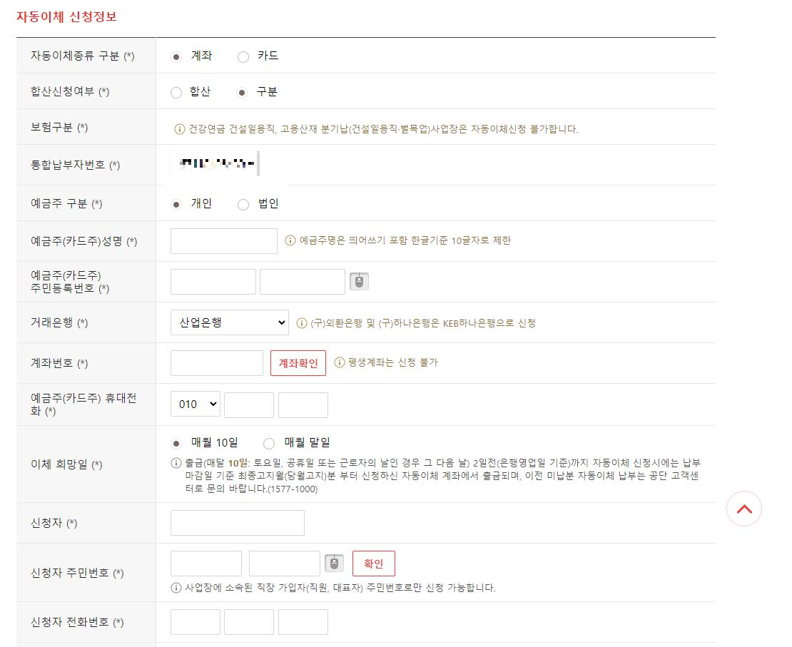 자동이체 신청을 클릭한 후 신청정보를 빠짐없이 기입하고 신청을 하면 됩니다. 상용직 근로자에 대해 매월 청구되는 고지서에 대해 자동이체신청이 가능하며, 일용/분기납 사업장은 자동이체가 불가합니다.