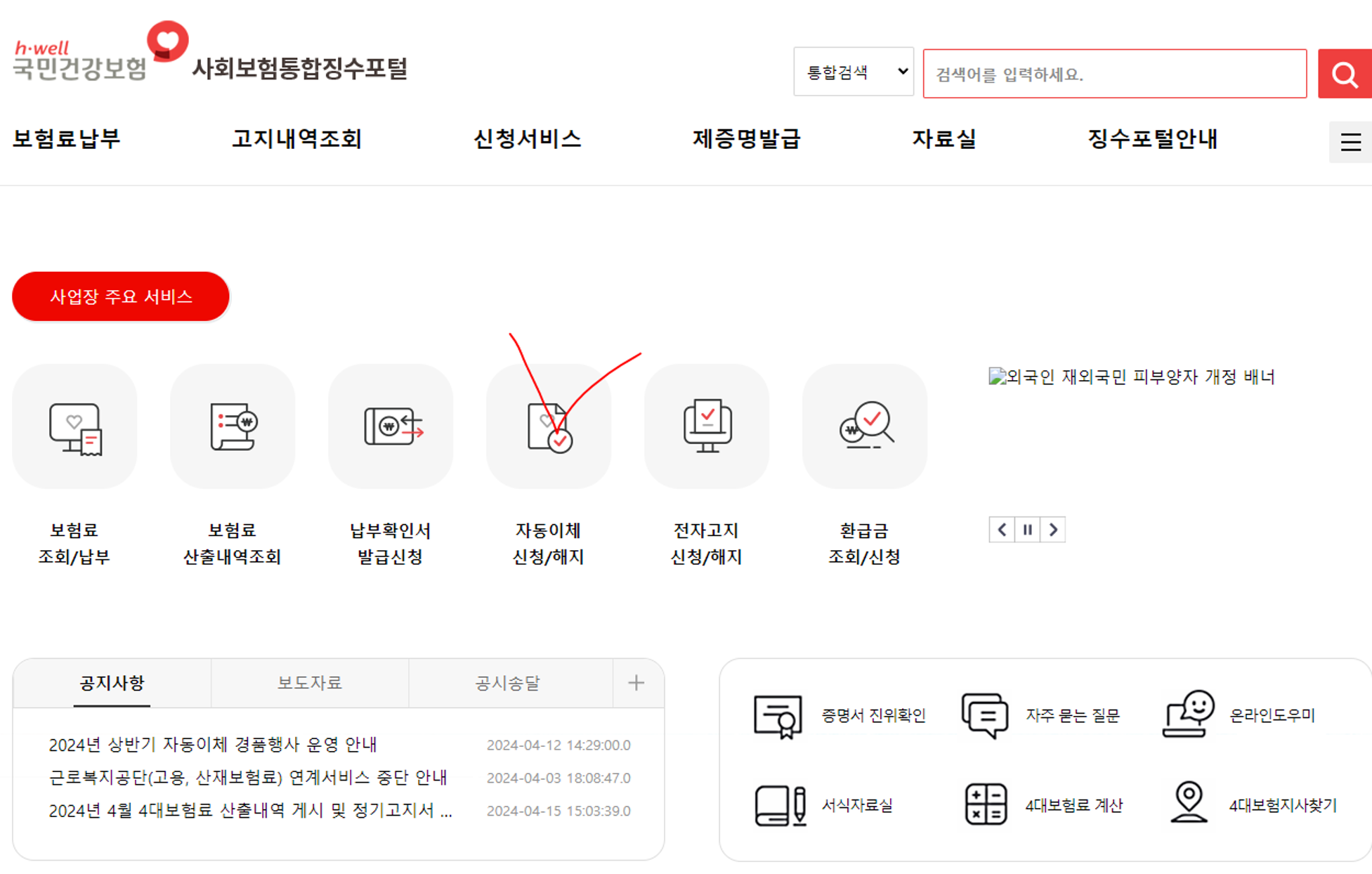 4대보험료 자동납부 신청/해지는 사회보험통합징수포털 사이트에서 진행합니다.