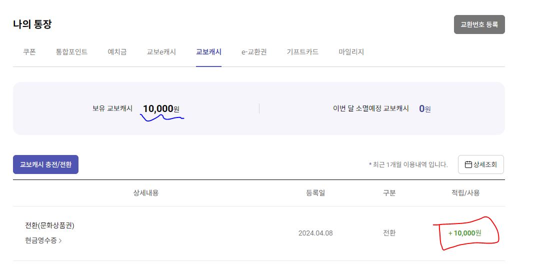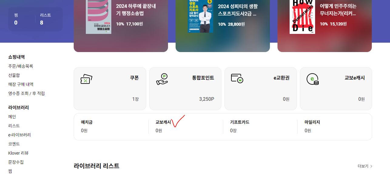 바로 교보캐시로 충전된것을 확인할 수 있습니다. 이제 교보캐시로 책을 구매하면 되니 참 쉽지요!!!