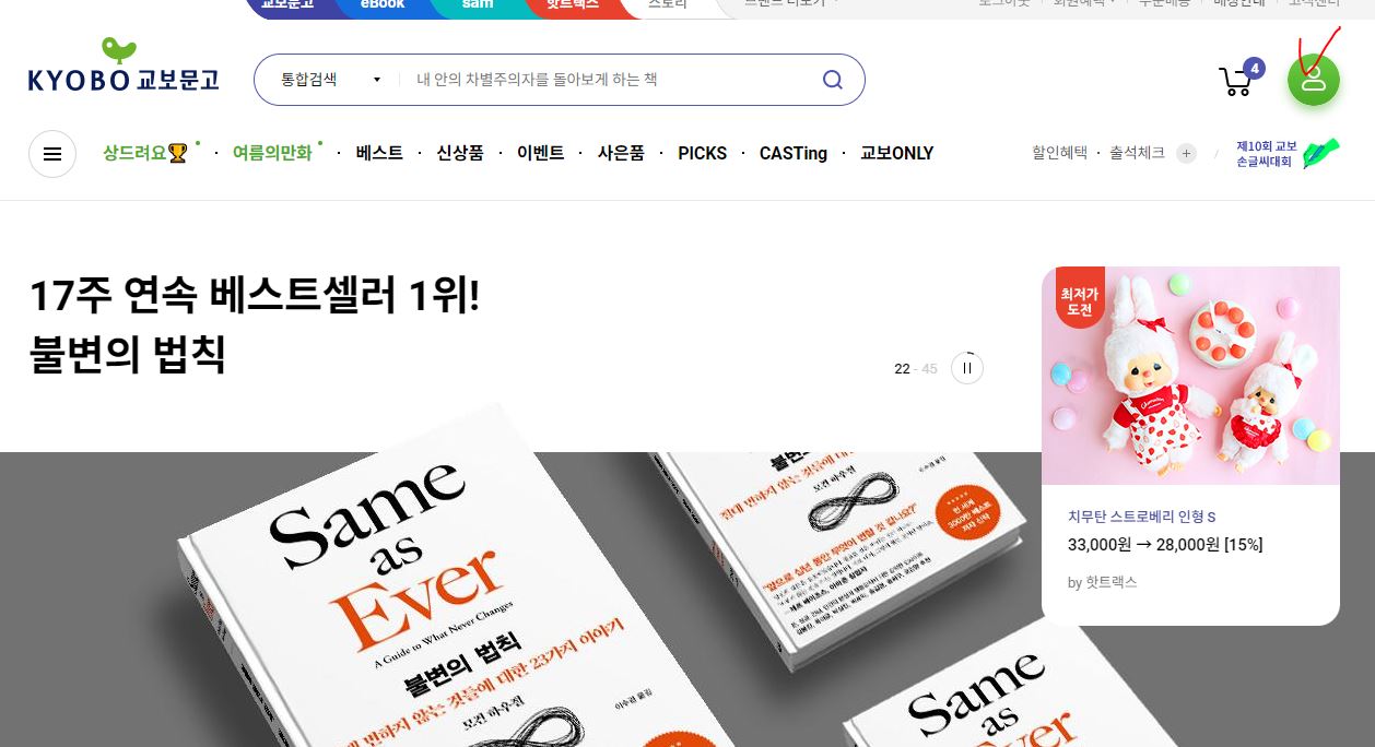 교보문고 홈페이지에 접속 후 먼저 로그인을 합니다. 회원가입이 안되어있다면 회원가입 후 로그인을 합니다. 로그인한 후 우측 상단의 마이(사람그림)를 클릭합니다.