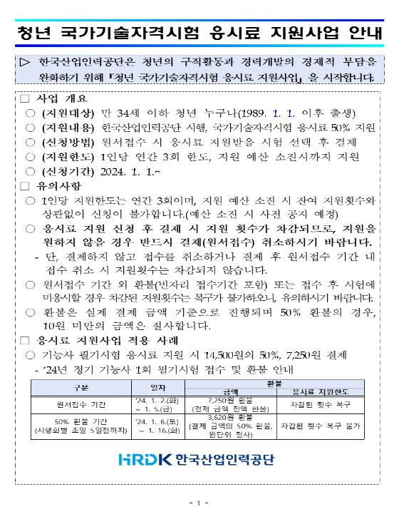 ★ 한국산업인력공단 시행, 국가기술자격시험 응시료 50% 지원