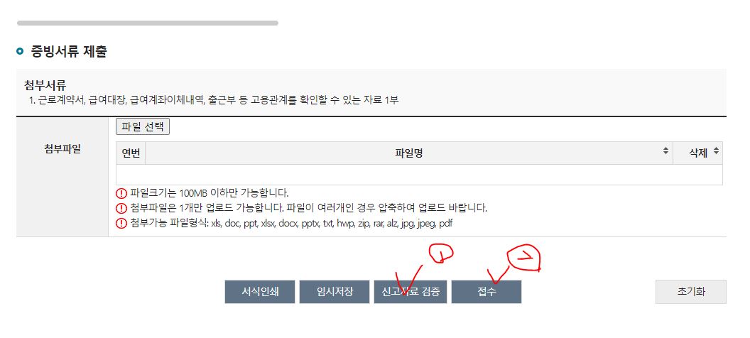근로자 한 명 한명 입력 후 대상자 추가를 한 뒤 모두 기입을 하였다면 [신고자료검증] 후 [접수]합니다.