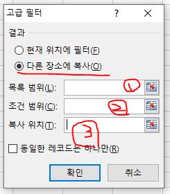 4. 목록범위, 조건범위, 추출하고자하는 위치를 선택 후 확인