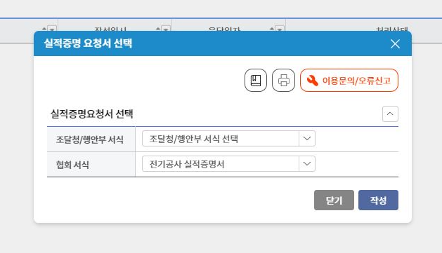 조달청/행안부서식, 협회서식을 각각 눌러 '실적증명서 요청서' 선택을 합니다.