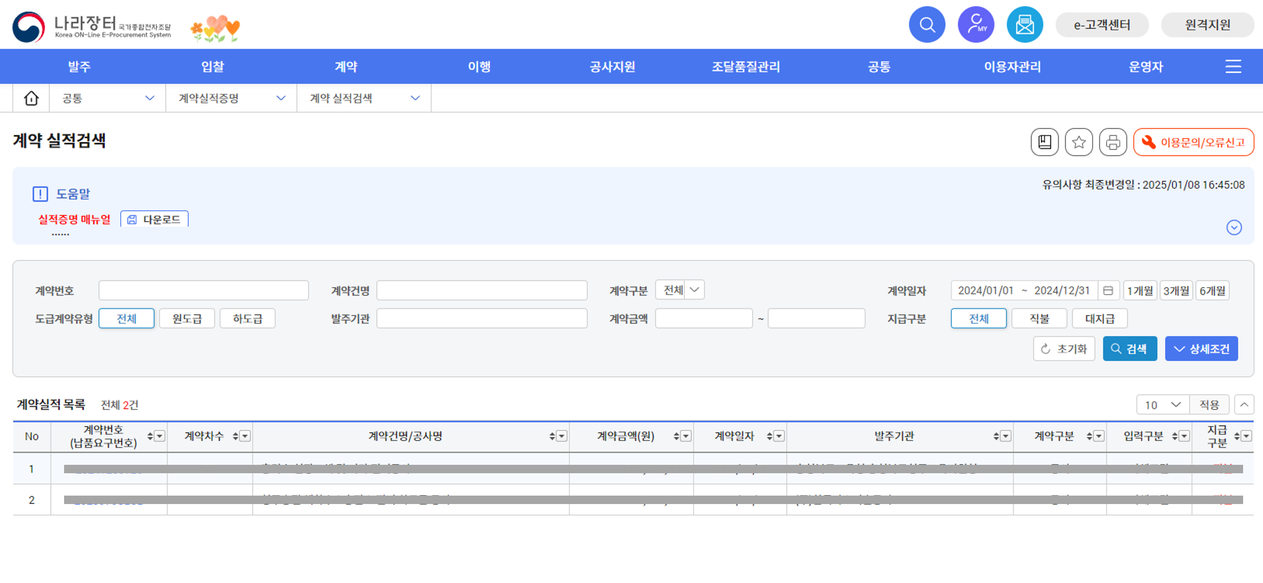 나라장터 홈페이지에 접속 후 [공통] - [계약실적증명]에서 [계약실적검색]을 클릭합니다.
