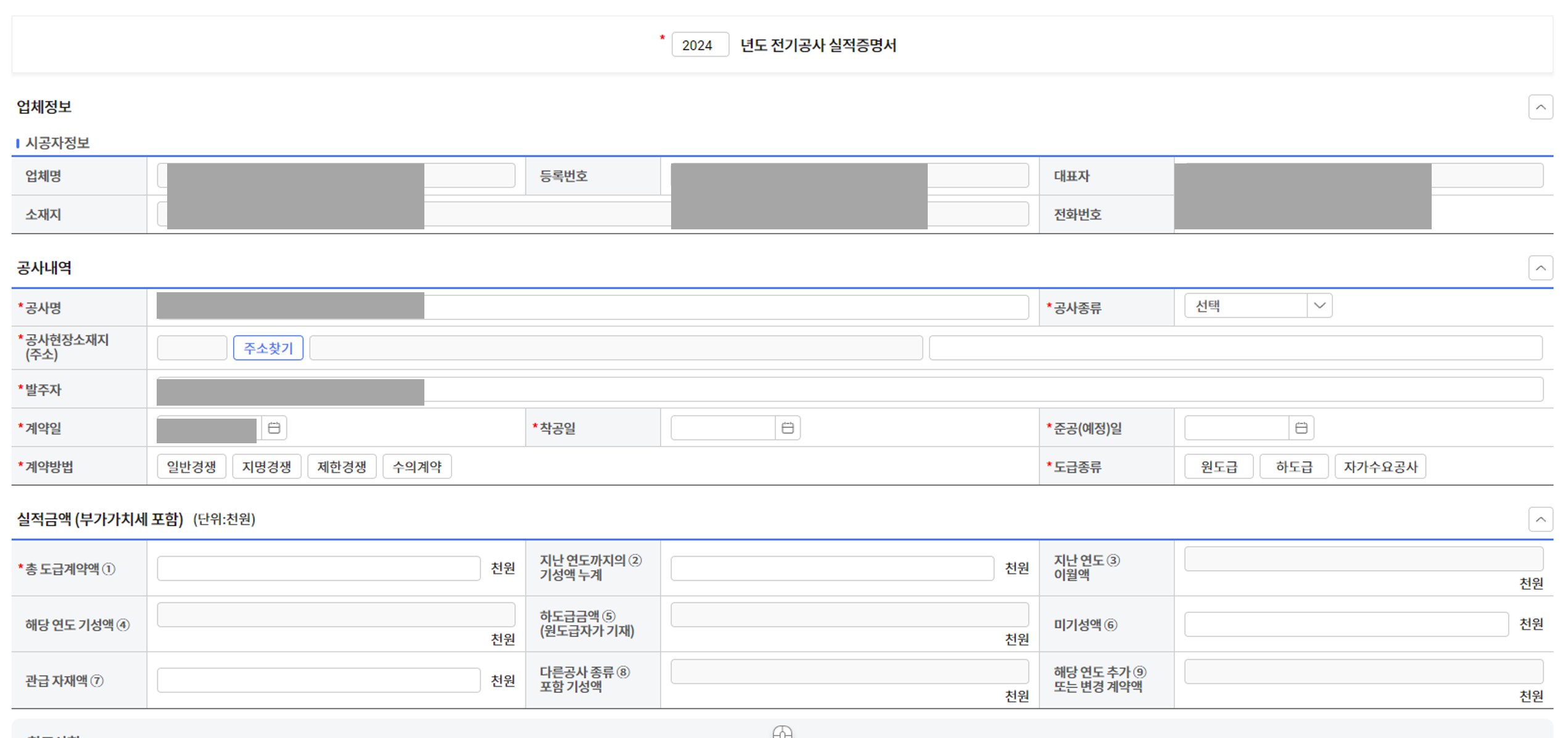 상단에 해당 연도를 기입 후, 공사내역에 해당자료를 입력한 후 하단에 [저장] - [요청]을 클릭합니다.