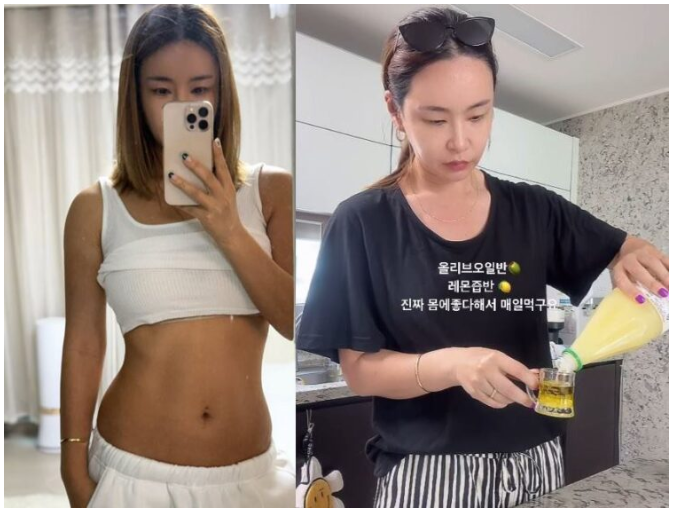 영상 속 배윤정은 작은 컵에 올리브오일과 레몬즙을 1대 1 비율로 섞어 만든 '올리브 레몬 샷'을 마시고 있다. 그는 "올리브오일 한 스푼에 레몬즙은 건강과 다이어트, 혈당 스파이크 방지에 좋다"고 추천했다.