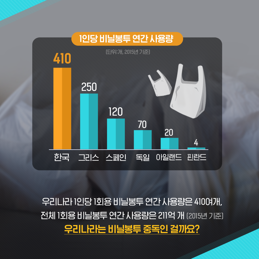 우리나라 1인당 1회용 비닐봉투 연간 사용량은 410여개 , 전체 1회용 비닐봉투 연간 사용량은 211억 개 (2015년 기준)