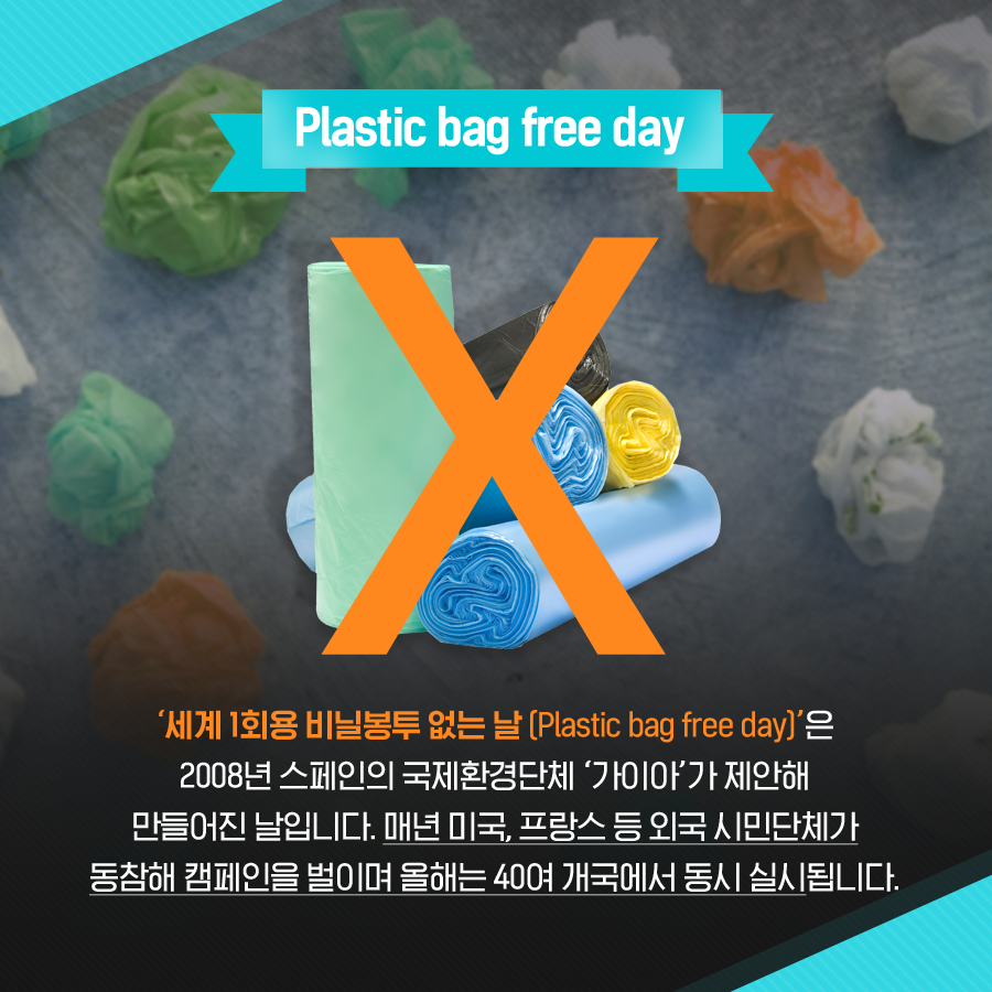 '세계 1회용 비닐봉투 없는 날(Plastic bag free day)' 은 2008년 스페인의 국제환경단체 '가이아'가 제안해 만들어진 날입니다.
