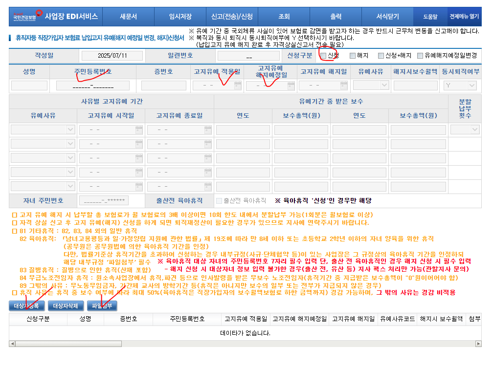건강보함edi서비스 접속 후 로그인 - 신고/신청 - 휴직자등 직장가입자 보험료 납입고지 유예 신청서 - 주민번호, 대상자등록, 파일 첨부 신고