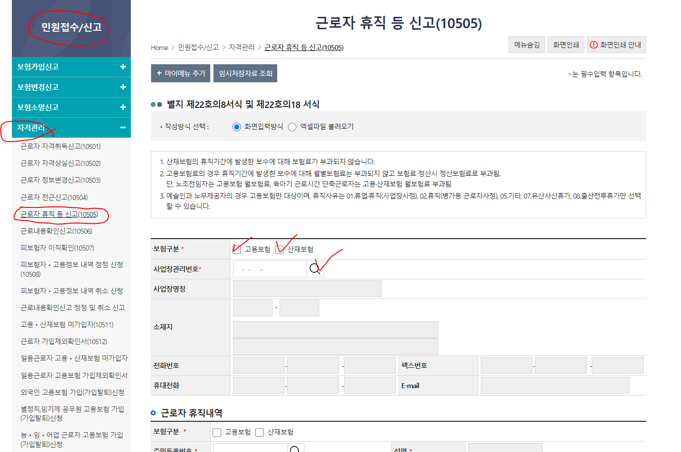 고용.산재보험 토탈서비스 홈페이지 로그인 - 민원접수/신고 - 자격관리 - 근로자휴직 등 신고 - 대상자 등록 후 신고