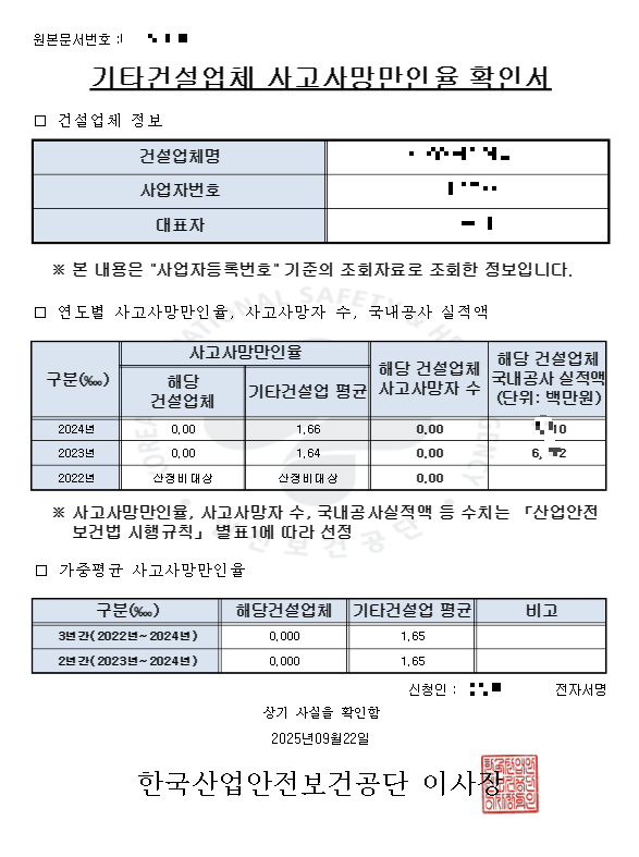 중간에 건설업체 산재예발활동 부분 아래 년도와 신청인 사고사망만일율 확인서 발급이라는 메뉴가 보입니다.